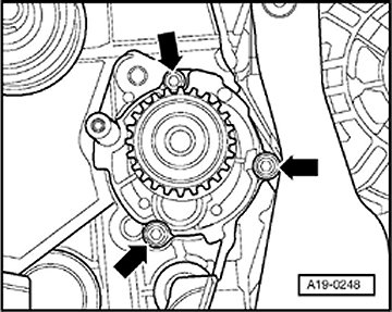 - Remove bolts - arrows - securing coolant pump and remove coolant pump.