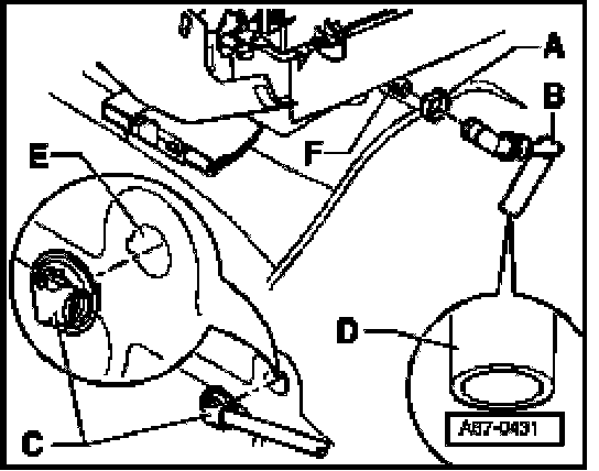 - Check distance of sound insulation mat in area of opening -E- to vehicle floor (the sound insulation mat should not touch the evaporator drain valve).