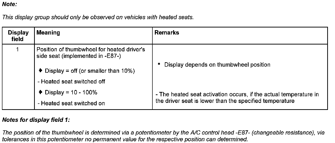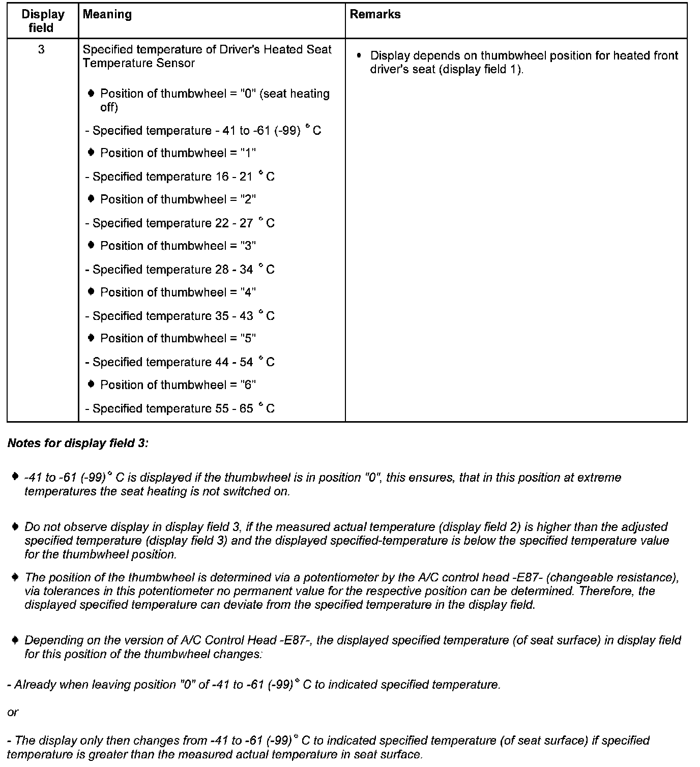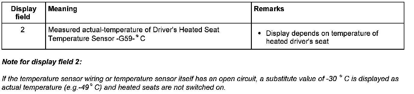 Position of thumb wheel for heated seat driver's side, actual and specified temperature of Driver's Heated Seat Temperature Sensor -G59- and activation of Driver's Heated Seat Temperature Sensor -G59-