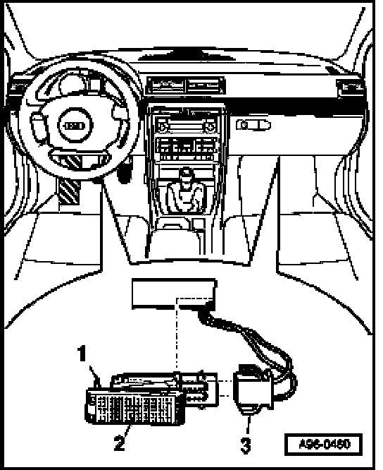 - Using a flat-tipped screwdriver, press in retaining tab -2- and pry out footwell light -1-.