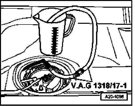 - Fit adapter V.A.G 1318/17-1 onto disconnected fuel return pipe and hold pipe in measuring container.