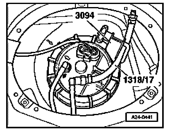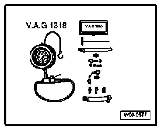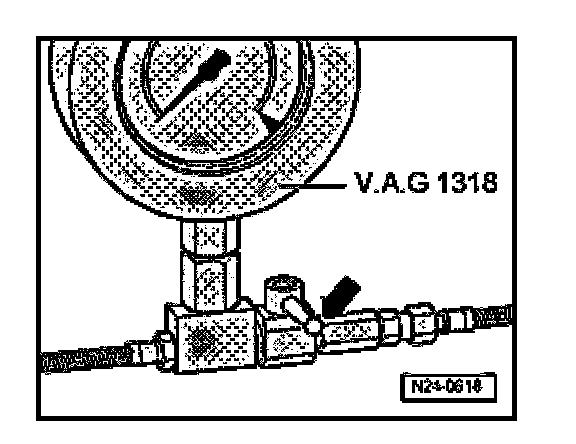 - Connect V.A.G 1318 pressure gauge in supply line using adapters 1318/6 and 1318/7.