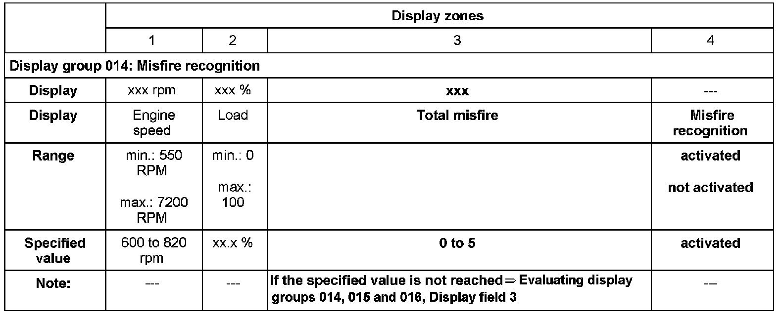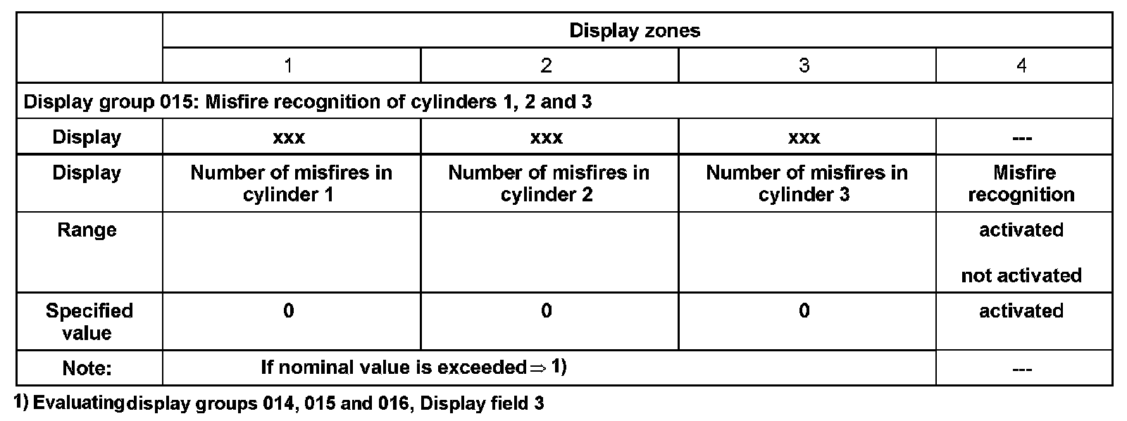 - Check misfire detection in display zones -1- and -4-.