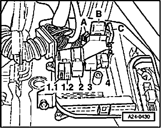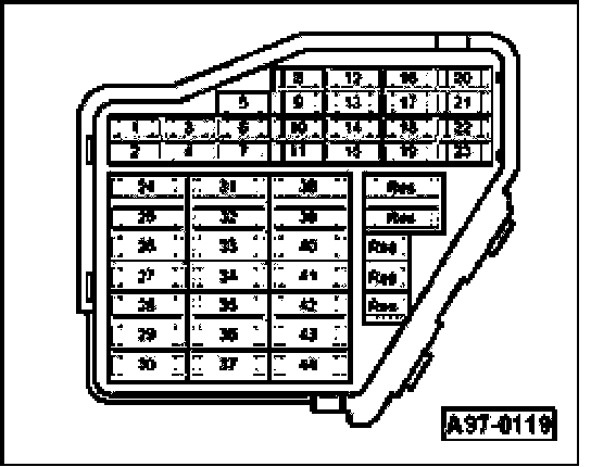 - Check wire connection from B+ (terminal 30) via Fuse for secondary air pump -S130- to Secondary Air Injection (AIR) Pump Relay -J299- (in relay and fuse carrier in E-Box, plenum chamber, position 3) for open circuit according to wiring diagram.