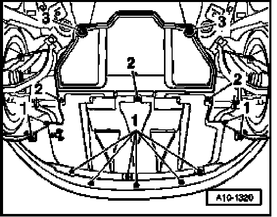 - Remove bolts or quick-release screws -1- and -2- and remove front noise insulation.