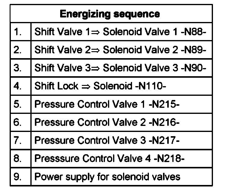 ^ Solenoid Valve 1 -N88-, Solenoid Valve 2 -N89, Solenoid Valve 3 -N90-, Pressure Control Valve 1 -N215- and Shift Lock Solenoid -N110- are tested acoustically during control element diagnosis. Ambient noises must be avoided during the acoustical test.