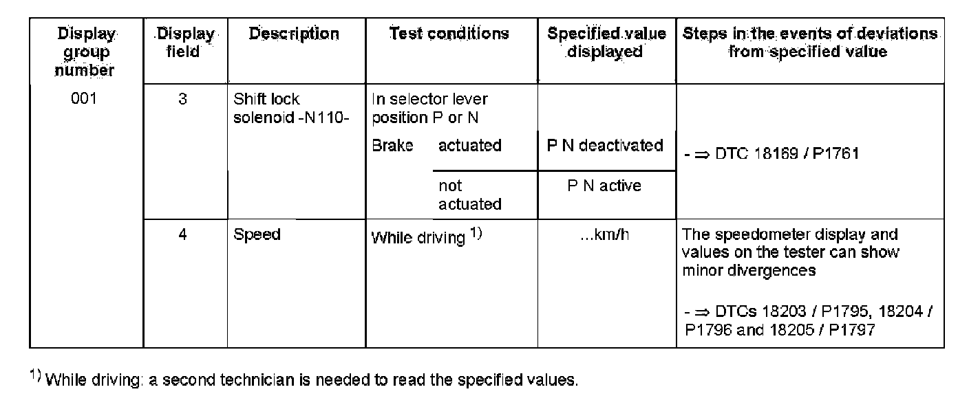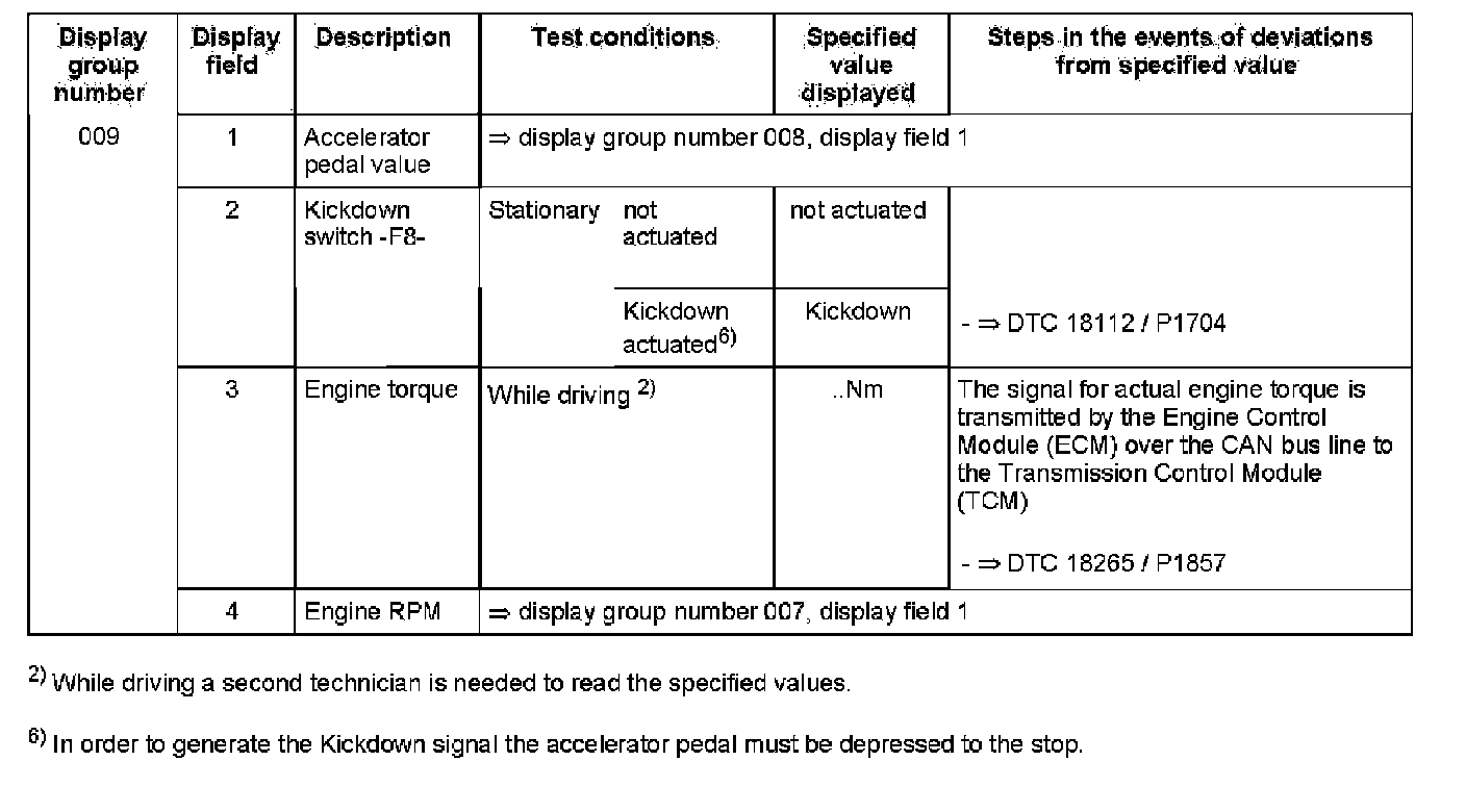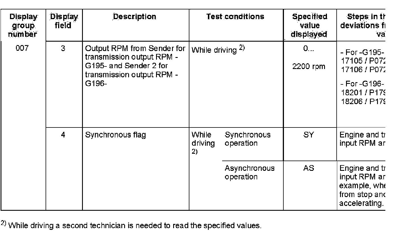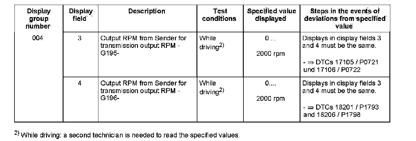 ^ If "0 RPM" is shown in display field 3 or 4, the corresponding sender is faulty and the Transmission Control Module (TCM) must be replaced.