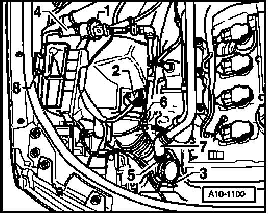 - Unbolt air filter housing -8- and remove, to do so, disconnect cable to Evaporative Emission (EVAP) Canister Purge Regulator Valve -N80- on underside of intake air hose.