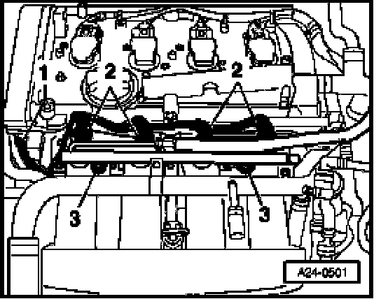 - Remove retaining bolts -3- of fuel distributor.