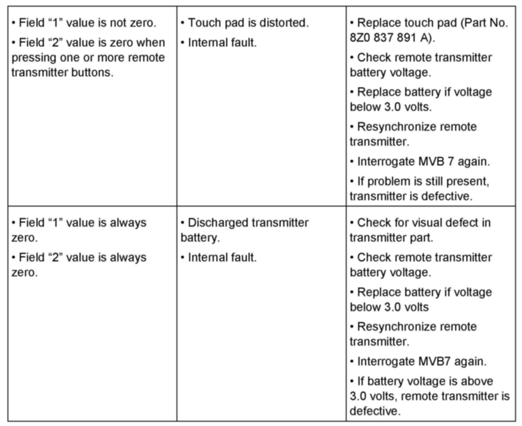 ^ Press all remote transmitter buttons while watching fields 1 and 2. Refer to table for diagnostic guidelines.