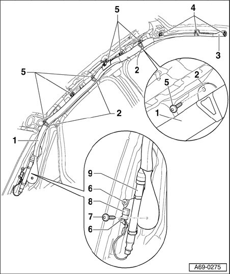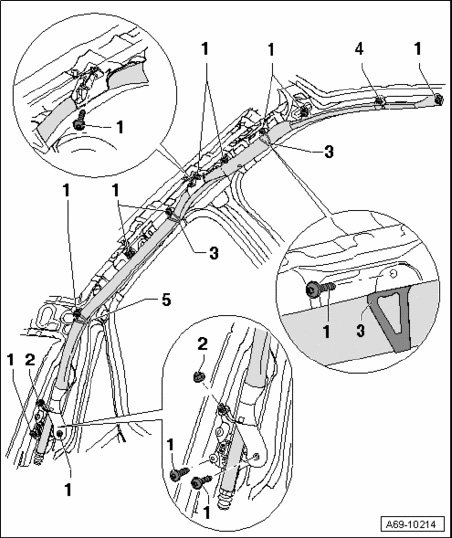 - Unclip bracket - 3 - and remaining brackets up to bracket - 5 - from roof frame.