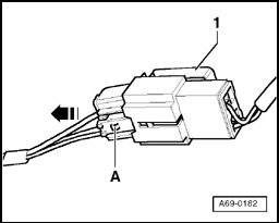- Press catch - A - and disconnect connector in direction of arrow.