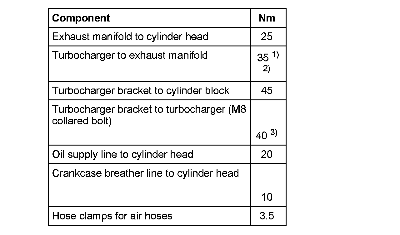 Turbocharger bracket to turbocharger (M8 collared bolt) 40 Nm 3)