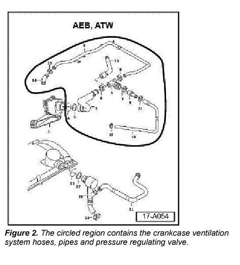 - Replace crankcase ventilation system hoses, pipes and pressure regulating valve depending on engine code. (See Figure 2 and compare to latest illustration on ETKA.)