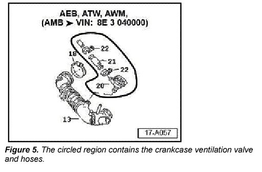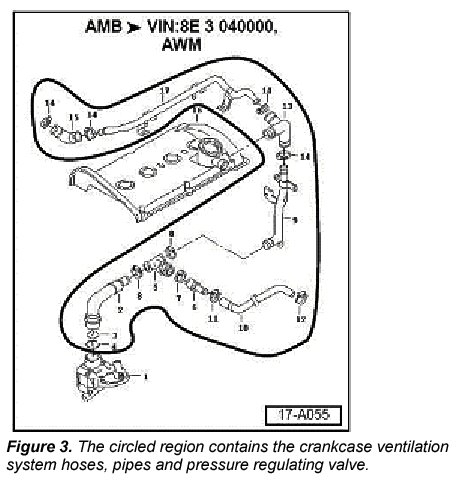 - Replace crankcase ventilation system hoses, pipes and pressure regulating valve depending on engine code. (See Figure 3 and compare to latest illustration on ETKA.)