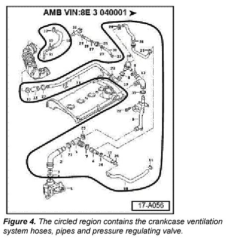 - Replace crankcase ventilation system hoses, pipes and pressure regulating valve depending on engine code. (See Figure 4 and compare to latest illustration on ETKA.)
