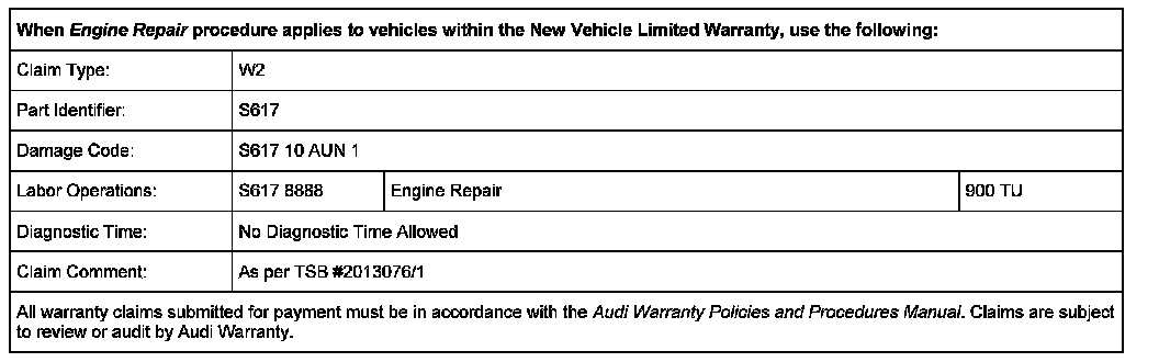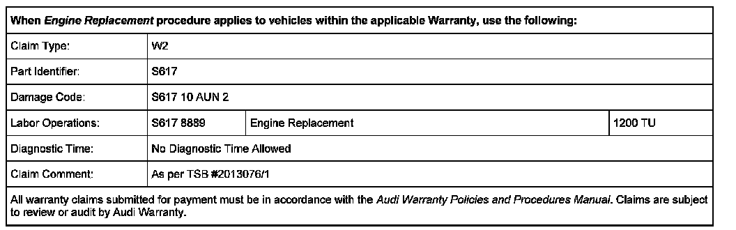 - For USA: Engine replacements require that all camshaft bearing caps be submitted to the Audi Warranty Test Center.