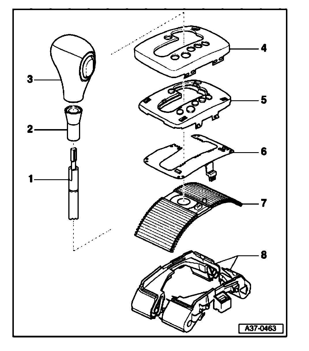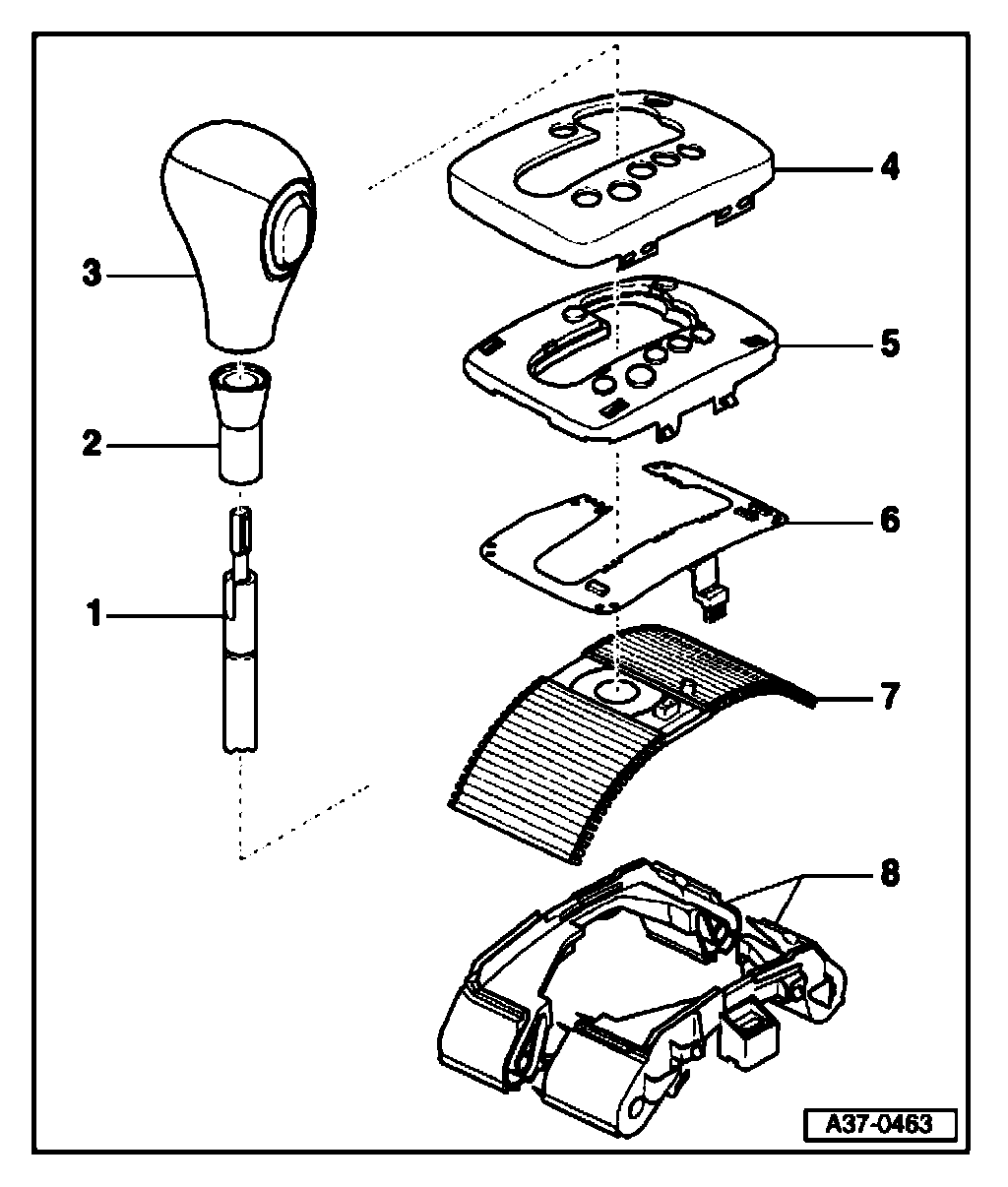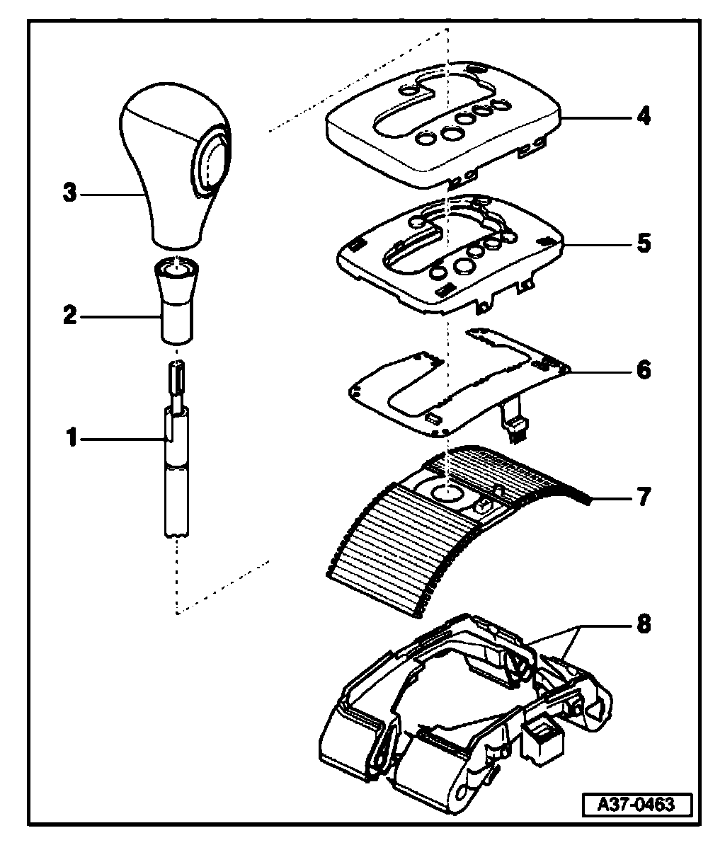Shift mechanism cover and selector lever knob, exploded view