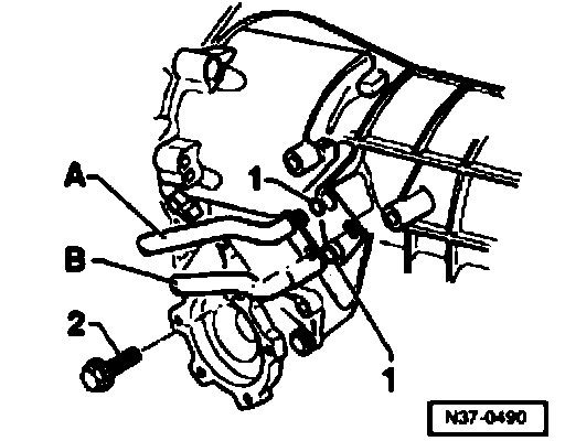 - Slide a hose with approximately 18 mm diameter onto ATF line -A- and secure with hose clamp. Place the other end of the hose into an appropriate container.