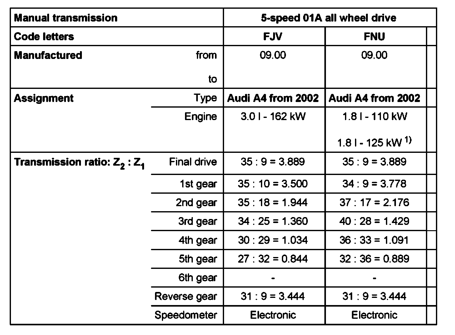 Manual transmission 01A all wheel drive is a 5speed transmission installed in connection with the 4-cylinder turbo engines and the 6-cylinder injection engines in the Audi A4 from 2002.