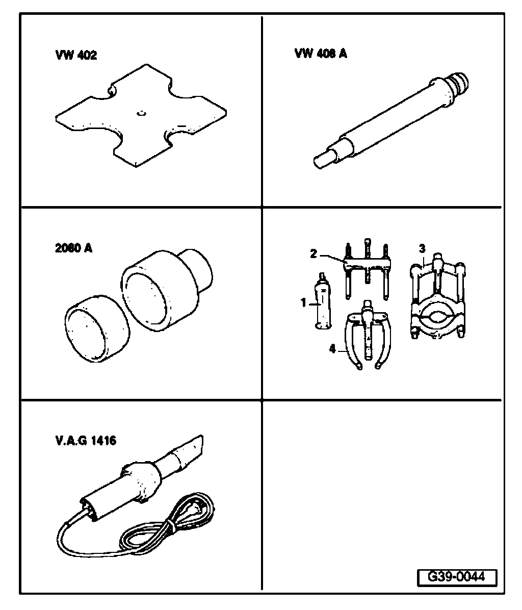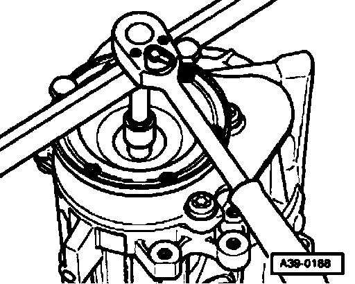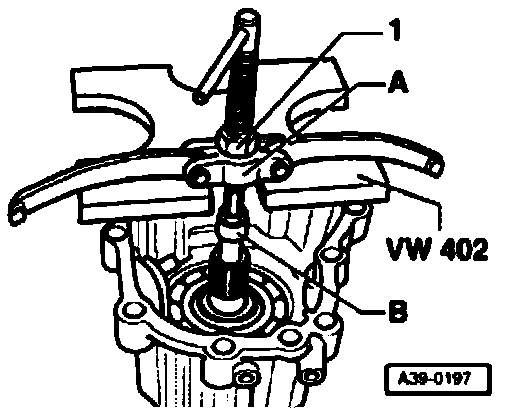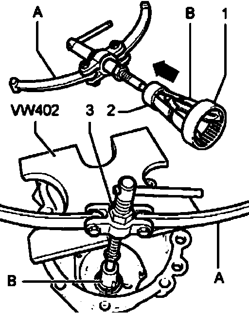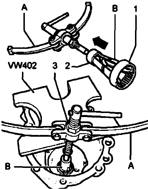 - Support retainer -A- using VW402 thrust plate and pre-tension at nut -3- of retainer.
