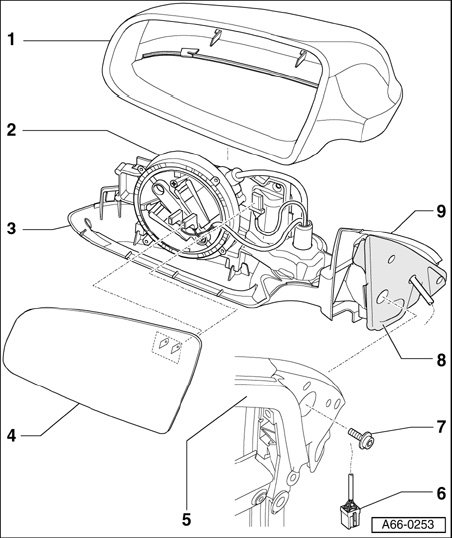 - To remove, pry off mirror lens, disconnect electrical harness connectors for mirror heater, remove phillips-head screws - 6 - and remove mirror adjusting unit from mirror housing - 1 -.