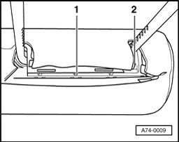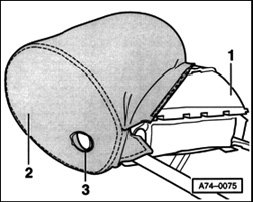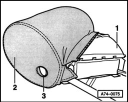 - Remove first headrest support - 1 - on the side lying opposite of button - 3 - from cushion with cover - 2 -.