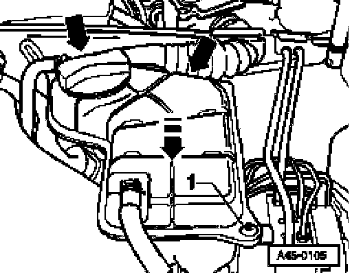 - Undo bolt -1- and pull it out in the direction of the arrow and swivel the coolant expansion tank to one side.