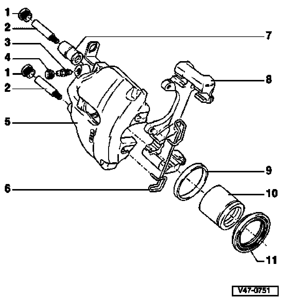 ^ Apply thin coat of paste G 052 150 A2 to brake cylinders, pistons and seals.