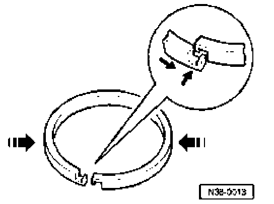 ^ If necessary, engage the ends of the installed piston rings (arrows), as depicted in the illustration.