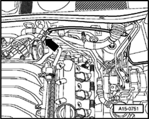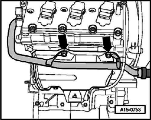 - Set aside hose of crankshaft housing ventilation (arrow).