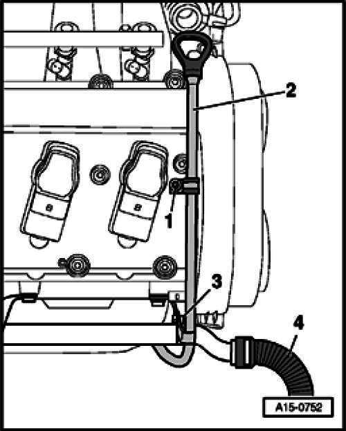 - Pull out guide tube for oil dipstick 2 from the oil pan (upper part) toward top and swing it forward for removal.