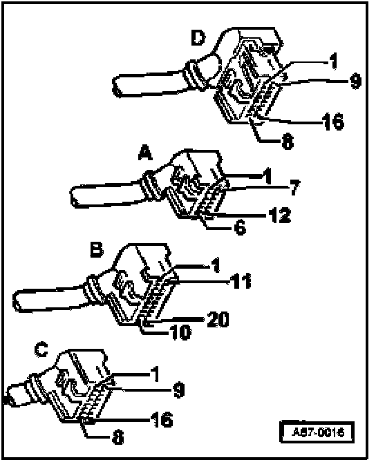NOTE: The terminal assignment of connector -C- on V.A.G 1598/11 adapter cable and connector -D- on V.A.G 1598/12 adapter cable is identical with the socket assignment on V.A.G 1598 A test box.