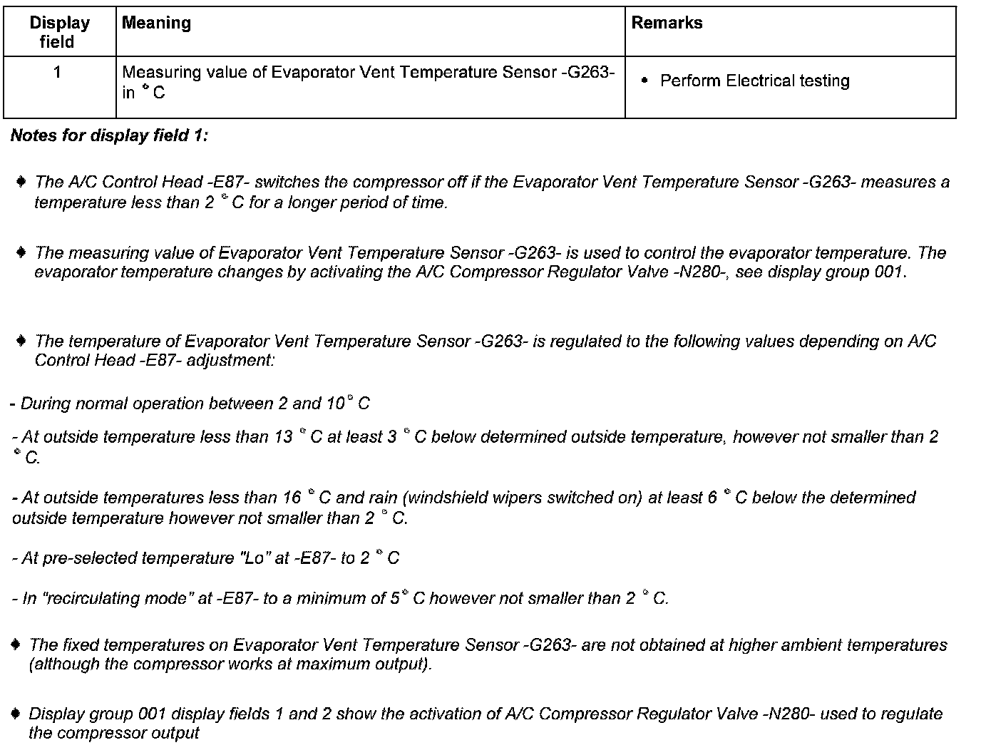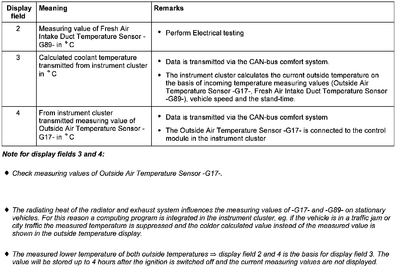 Measuring values for Evaporator Vent Temperature Sensor -G263-, Fresh Air Intake Duct Temperature Sensor -G89-, Outside Air Temperature Sensor -G17- and calculated outside temperature transmitted from instrument cluster