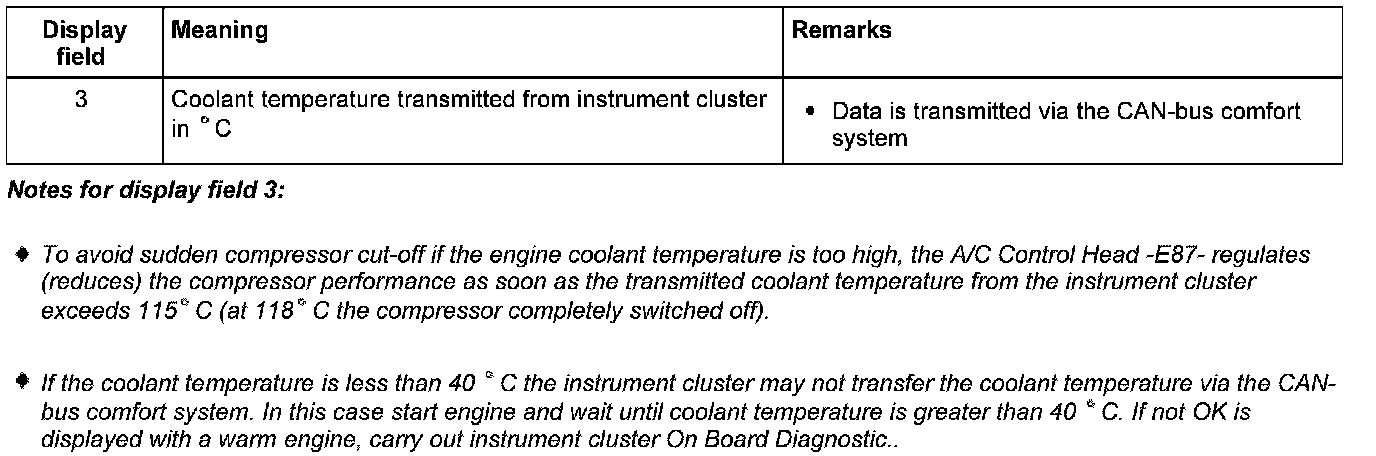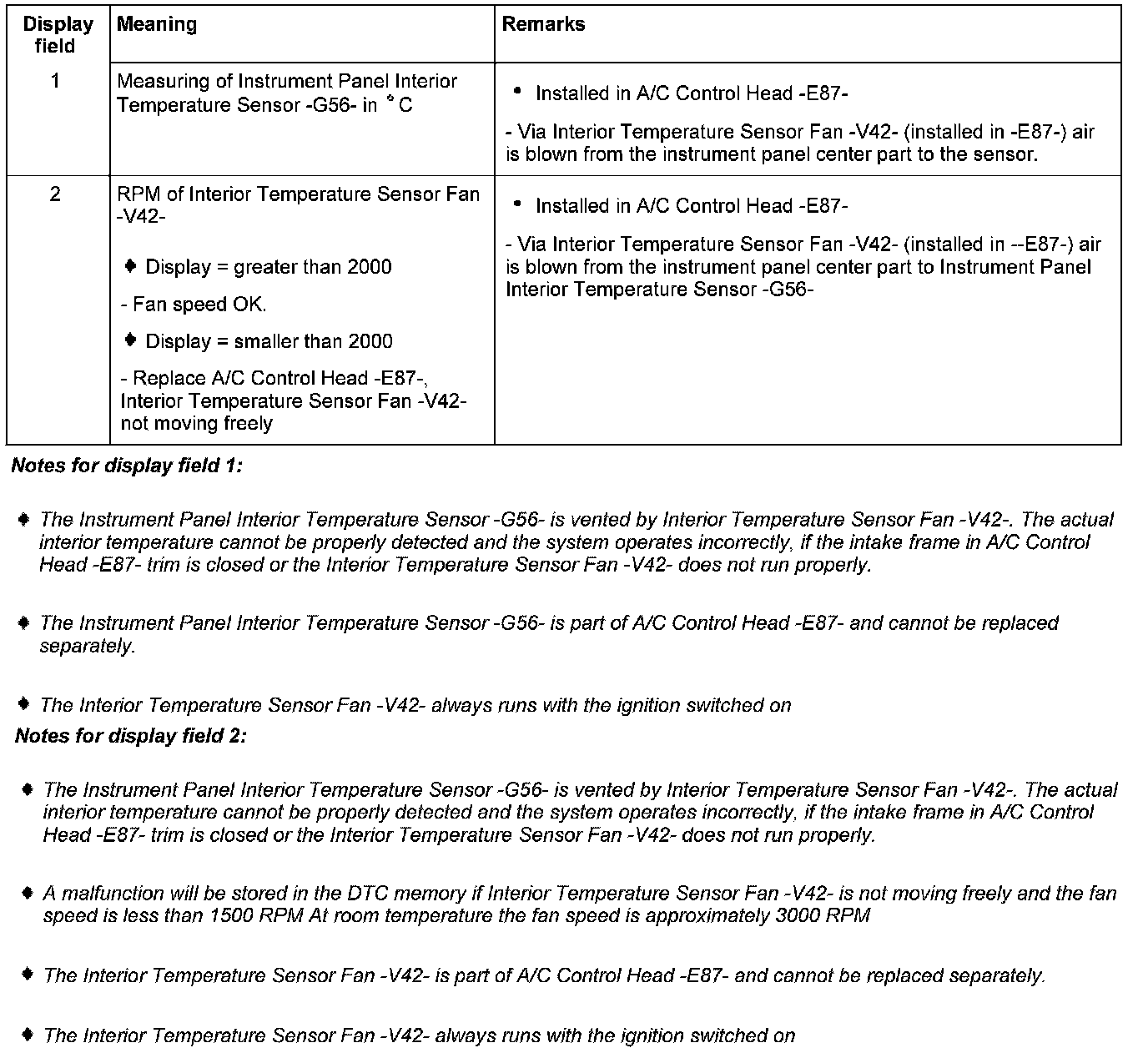 Measuring value of Instrument Panel Interior Temperature Sensor -G56-, the measured RPM of Interior Temperature Sensor Fan -V42-, coolant temperature transmitted by instrument cluster and output activation for idle air control increase