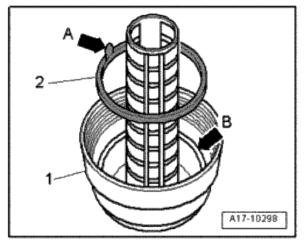 - Insert new sealing ring - 2 - with semicircular profile in groove - arrow B - on cap.