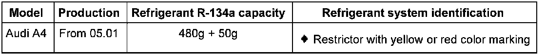 - Only restrictors with red or yellow color markings should be installed so that the cooling performance of the climate control system is not changed. As of m.y. 2002, only restrictors with red color markings are installed in the Audi A4, if a restrictor with a yellow color marking is installed in this vehicle, there should be no change in system capacity for this vehicle, see Parts department.