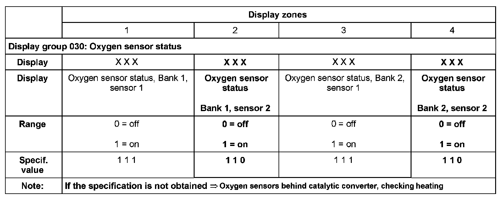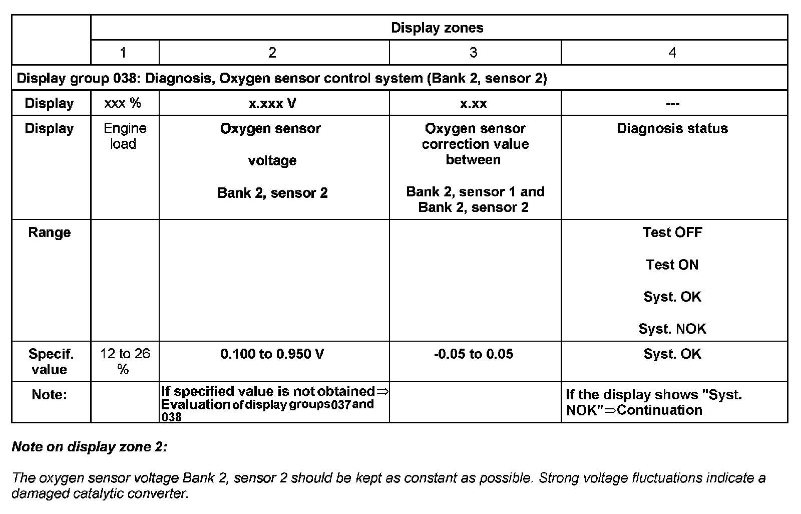 NOTE: The oxygen sensor before catalytic converter (bank 1, sensor 1 and bank 2, sensor 1) regulates to oxygen sensor 1. If this oxygen sensor is damaged, e.g. due to soiling or overheating, the regulation value may have shifted. Deviations from oxygen sensor 1 are detected by the oxygen sensor behind catalytic converter (bank 1, sensor 2 and bank 2, sensor 2). If it recognizes the deviations downward or upward, it influences the regulation before catalytic converter, generally increasing or decreasing it respectively.