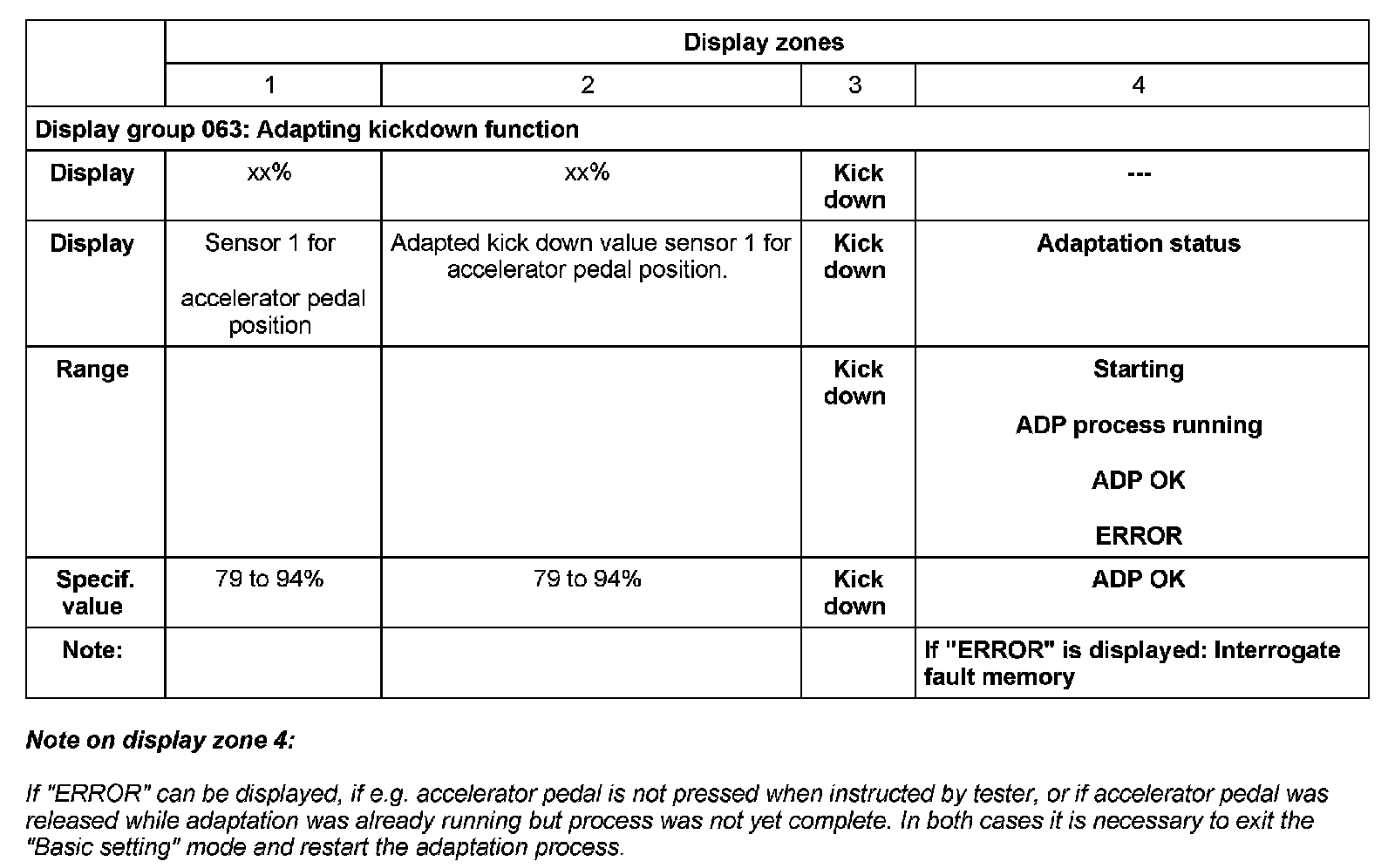 NOTE: During the kickdown point adaptation process, "Kickdown ADP running" is shown on the display. After successful adaptation of the kickdown point "Kickdown ADP OK" appears on the display.