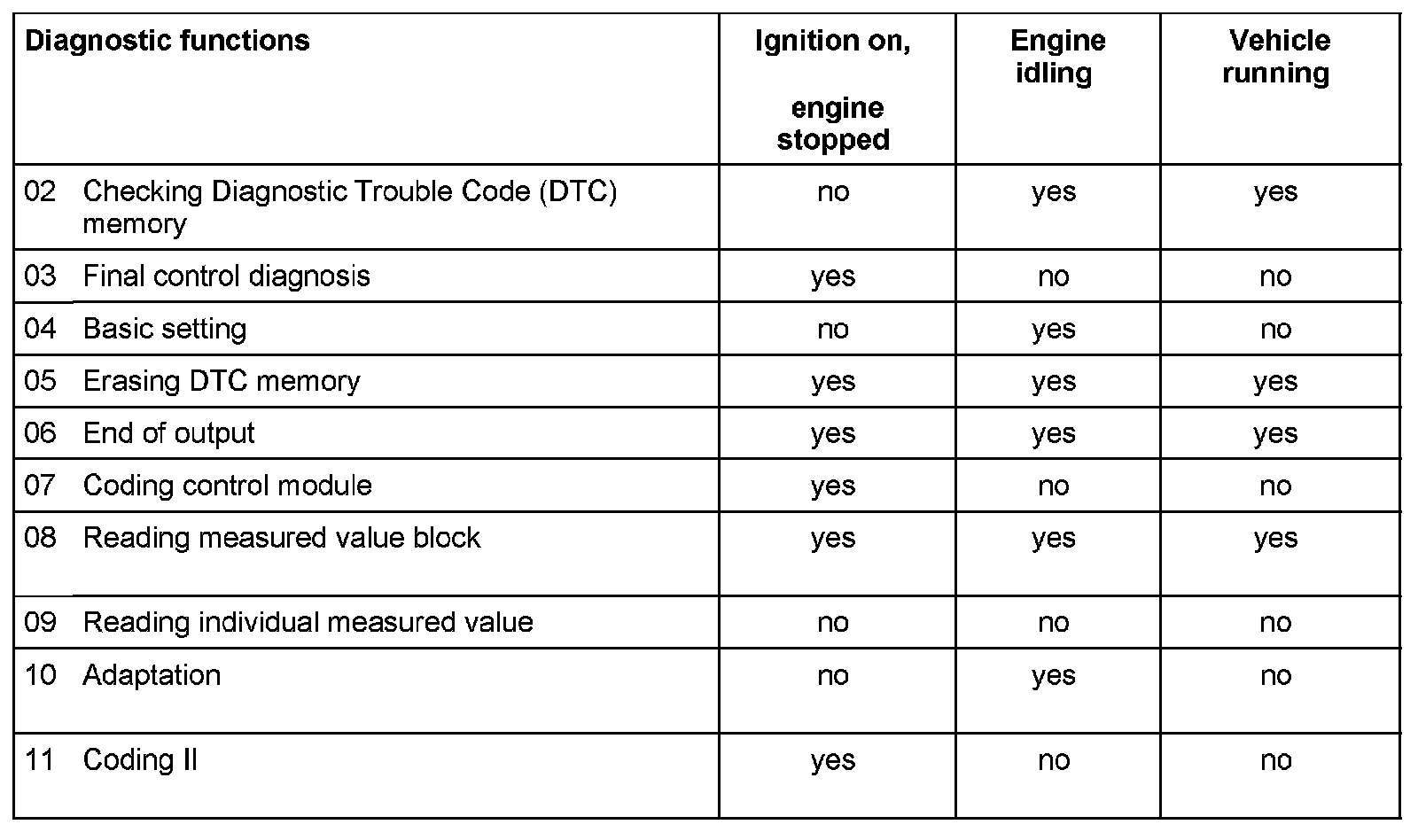 Selectable Functions When Using VAG1551/1552 or VAS5051