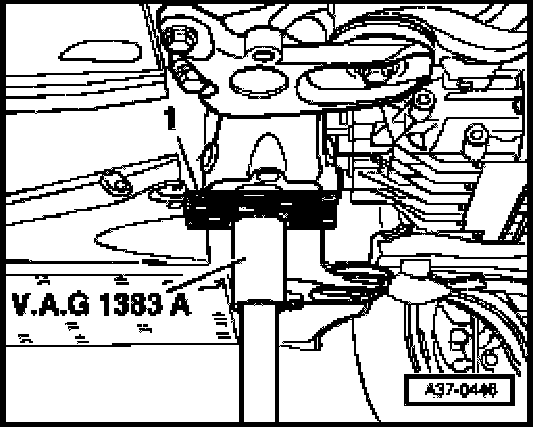 - Remove VAG1359/2 universal mount from VAG1383A engine/transmission jack and place a piece of wood -1- onto punch instead.
