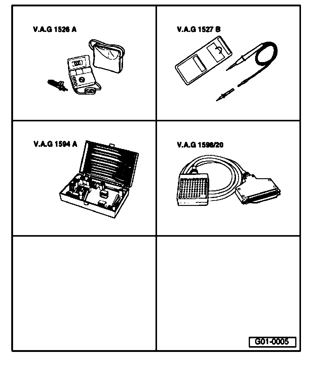 ^ For testing, use Multimeter V.A.G 1526 A or Vehicle Diagnosis, Measurement and Information System VAS 5051. The charts contain the specific measurement methods which have to be set up before the corresponding measurements.