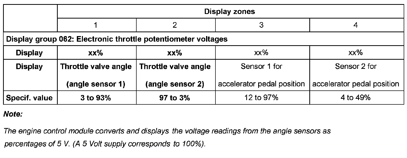 - The reason why the value in display zone 1 rises and that in zone 2 falls is that the potentiometers (angle sensors) in the throttle valve control module operate in opposite directions.