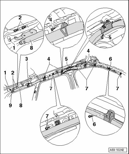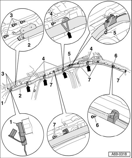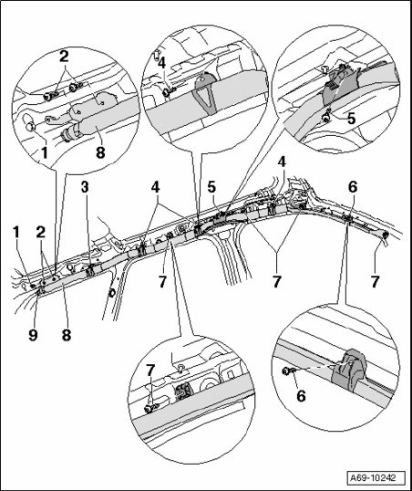 - Unclip bracket - 6 - and remaining brackets up to bracket - 3 - from roof frame. Firmly hold side curtain airbag.