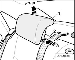 - Push release button - 2 - in - direction of arrow A - and pull headrest - 1 - upward as far as possible - arrow B -, keep release button pushed while doing so.