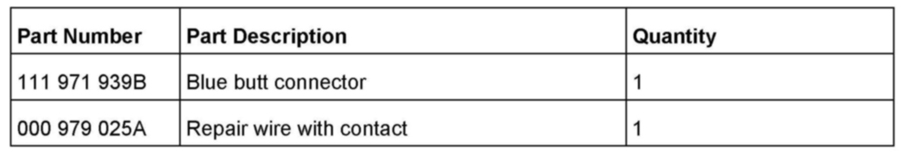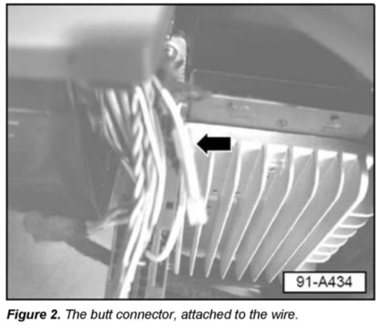 5. Strip the insulation on both wire ends approximately 1/4 inch. Install blue butt connector (part number 111 971 939B) and crimp onto only the harness side of the wire.