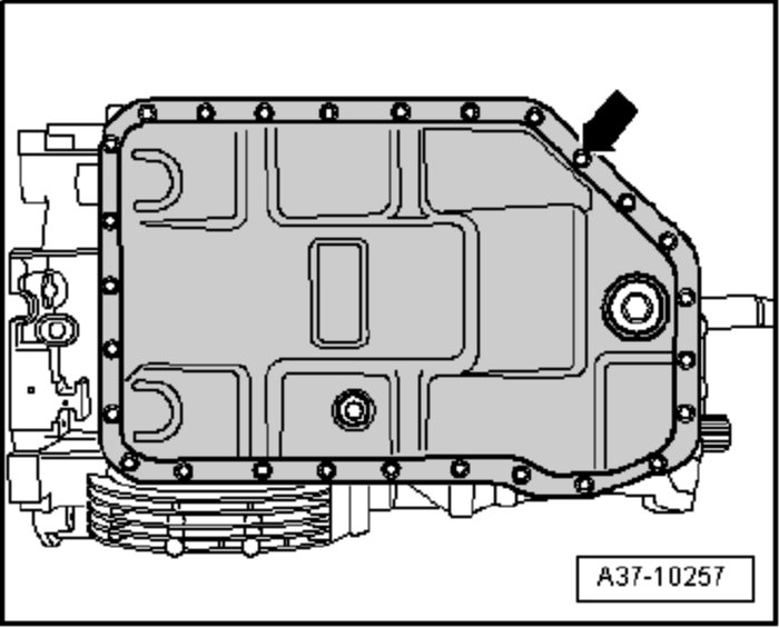 Tighten oil pan bolts -arrow- diagonally in several stages.