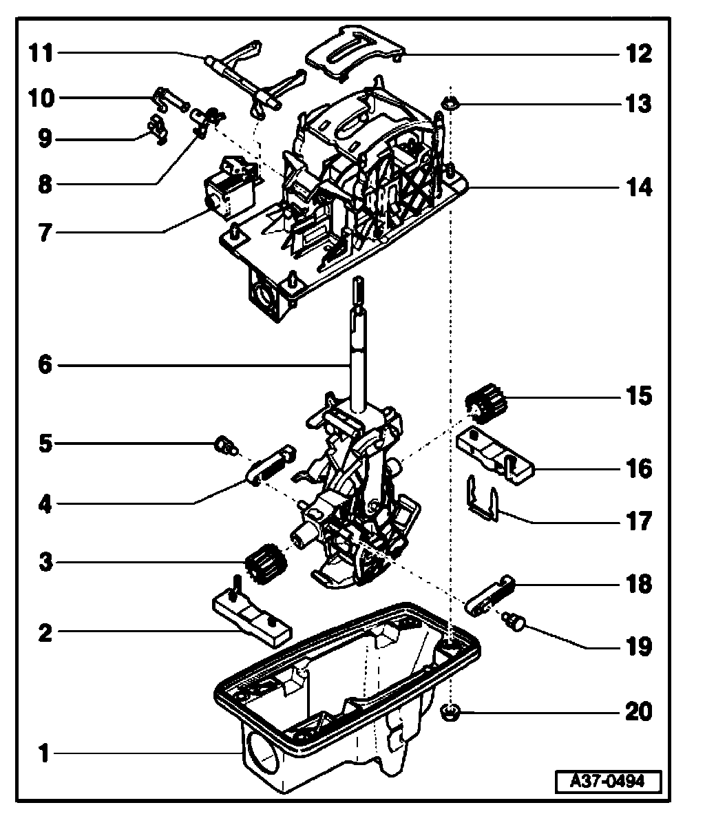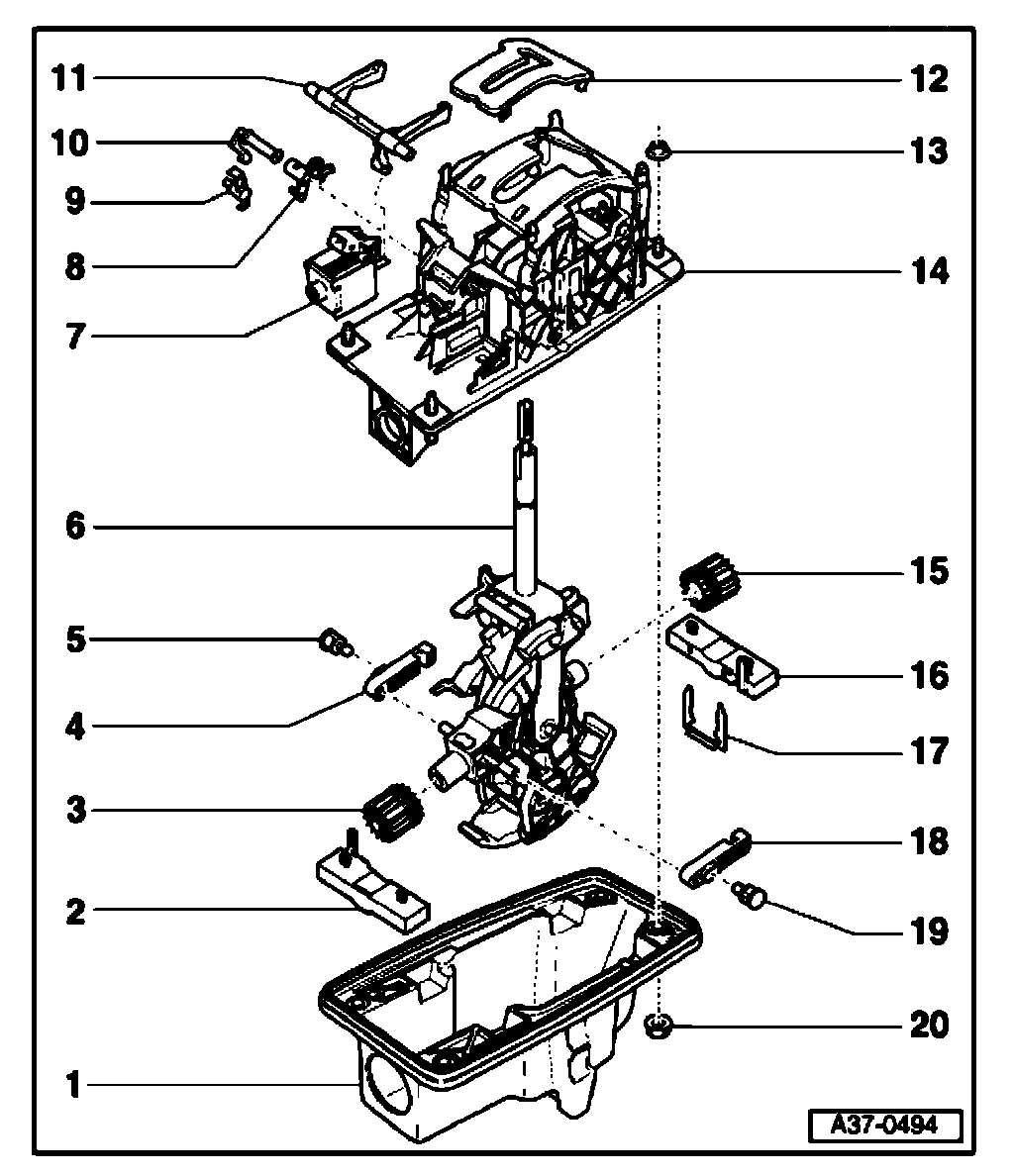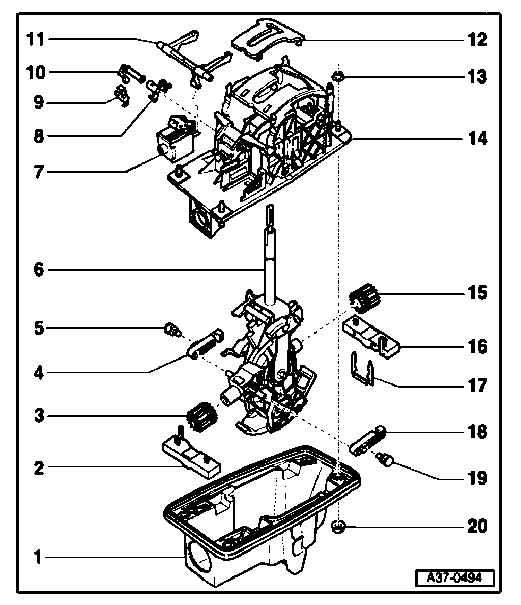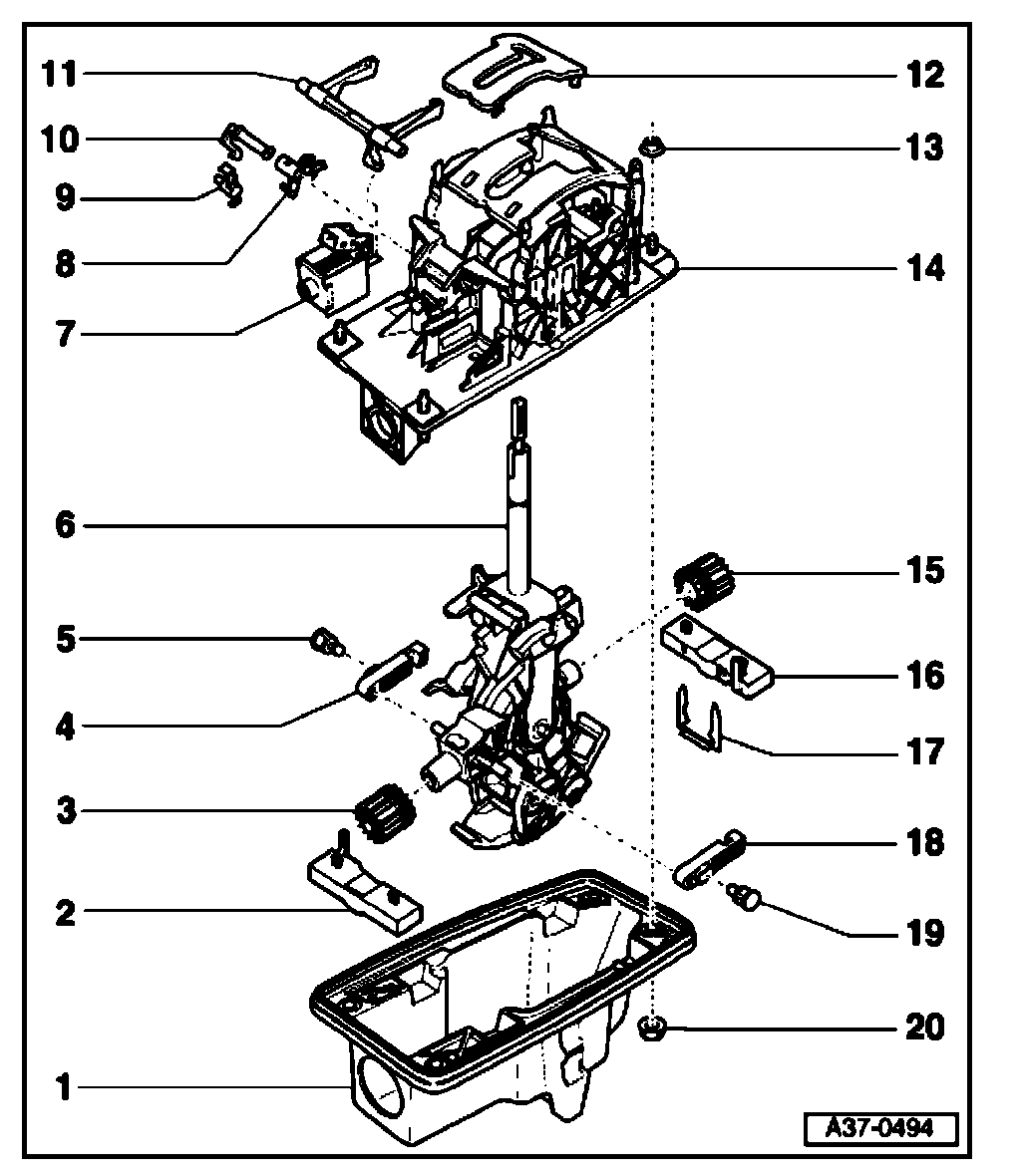 - Pull selector lever -6- with bushes -3- and -15- together with locking levers for Tiptronic -4- and -18- downward out of selector housing -14-.