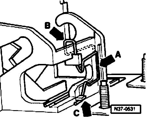 - Insert spring (arrow B) from top and hook in at retaining clip (arrow C).