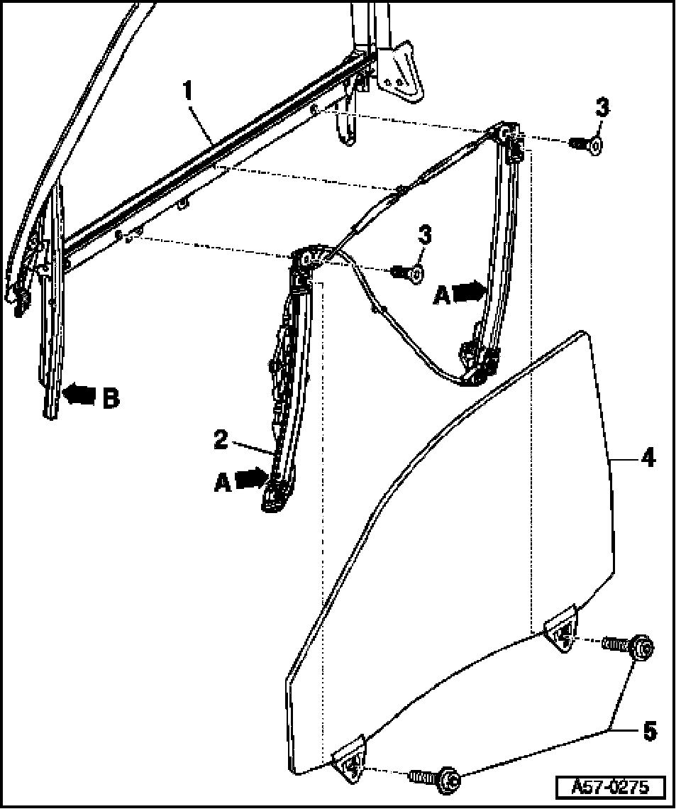 - Pull door window backwards into window guide of frame on B-pillar and tighten bolts -5- to 4 Nm.